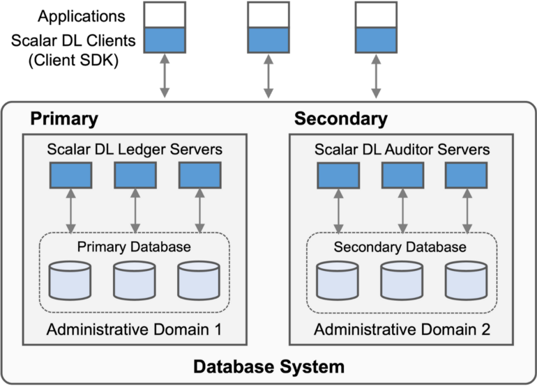 Ledger はそれ自体だけでユーザーにサービスを提供できます。このような場合、ScalarDL は、データベースに依存しないトランザクション機能を除いて、Oracle Blockchain Table や Amazon QLDB と同様に機能します。つまり、ScalarDL は単一の管理ドメイン (AD) でデータベースを管理するため、一部の限られたクラスのビザンチン故障のみを検出します。